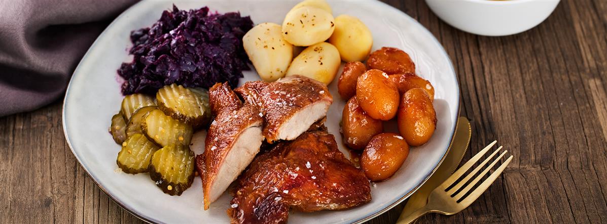 Flæskesteg m. rødkål og agurkesalat
